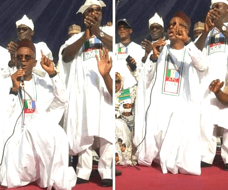 Governor Nasir El-Rufai of Kaduna State went all out on Thursday, going down on his knees to canvass support for Governor Yahaya Bello’s re-election...