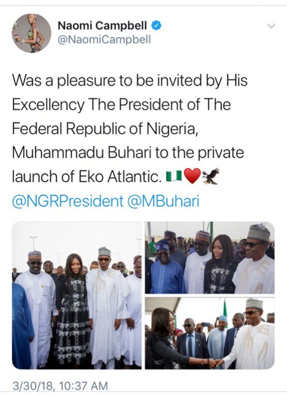 “For the sake of clarity, President @MBuhari didn’t invite Ms. Naomi Campbell to any event during his 2-day visit to Lagos State. They only met at the Eko Atlantic City while Mr. President was touring the project, and she requested to take photos with him,” Ahmaad tweeted.